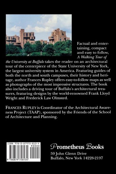 Factual and entertaining, compact and easy to follow, A Walking Tour of the University at Buffalo takes the reader on a fascinating architectural tour of the State University of New York, the centerpiece of America's largest university system. Featuring guides of both the north and south campuses, their history and heritage, author Frances Rupley offers easy-to-follow maps as well as photographs of the most impressive structures. At the turn of this century, Buffalo was one of the largest and most prosperous cities in the United States. It had a rich cultural and religious diversity, attracting immigrants from all of Europe to its many industries and transportation centers. These groups then formed ethnic neighborhoods, many of which remain. A Walking Tour also includes a leisurely driving tour of the city of Buffalo's many architectural treasures - including the Darwin D. Martin House, the Buffalo and Erie County Historical Society, Delaware Park, the Albright-Knox Art Gallery, Kleinhans Music Hall, Pilot Field and much more - featuring designs by the world-renowned Frank Lloyd Wright, Frederick Law Olmsted, and many others. Sixty-eight black and white photographs, a glossary of architectural terms, and a complete index make this book versatile, engaging, and a joy to read as you explore the wonders of the "City on the Lake" and the crown jewel of the SUNY system.