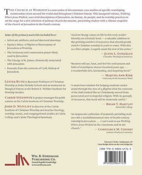 The Church at Worship is a series of documentary case studies of specific worshiping communities from around the world and throughout Christian history. This inaugural volume, Walking Where Jesus Walked, uses vivid descriptions of Jerusalem, its history, its people, and its worship practices to set the stage for a rich selection of primary church documents, presenting readers with a vibrant snapshot of the church at Jerusalem in the fourth century. Some of the primary materials included here:Select art, artifacts, and architectural drawings Egeria's Diary: A Pilgrim's Observations of Jerusalem at Worship The lectionary and communion prayer likely used in Jerusalem The Liturgy of St. James, historically associated with Jerusalem Excerpts from the sermons of Cyril, bishop of Jerusalem