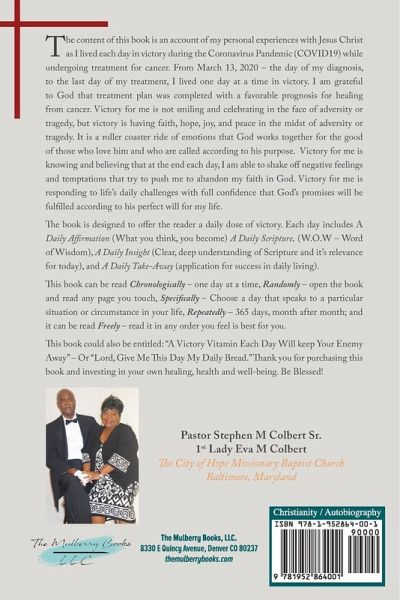 The content of this book is an account of my personal experiences with Jesus Christ as I lived each day in victory during the Coronavirus Pandemic (COVID19) while undergoing treatment for cancer. From March 13, 2020 - the day of my diagnosis, to the last day of my treatment, I lived one day at a time in victory. I am grateful to God that treatment plan was completed with a favorable prognosis for healing from cancer. Victory for me is not smiling and celebrating in the face of adversity or tragedy, but victory is having faith, hope, joy, and peace in the midst of adversity or tragedy. It is a roller coaster ride of emotions that God works together for the good of those who love him and who are called according to his purpose. Victory for me is knowing and believing that at the end each day, I am able to shake off negative feelings and temptations that try to push me to abandon my faith in God. Victory for me is responding to life's daily challenges with full confidence that God's promises will be fulfilled according to his perfect will for my life. The book is designed to offer the reader a daily dose of victory. Each day includes A Daily Affirmation (What you think, you become) A Daily Scripture, (W.O.W - Word of Wisdom), A Daily Insight (Clear, deep understanding of Scripture and it's relevance for today), and A Daily Take-Away (application for success in daily living). This book can be read Chronologically - one day at a time, Randomly - open the book and read any page you touch, Specifically - Choose a day that speaks to a particular situation or circumstance in your life, Repeatedly - 365 days, month after month; and it can be read Freely - read it in any order you feel is best for you. This book could also be entitled: "A Victory Vitamin Each Day Will keep Your Enemy Away" - Or "Lord, Give Me This Day My Daily Bread." Thank you for purchasing this book and investing in your own healing, health and well-being. Be Blessed!
