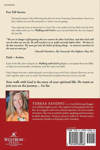Feet Tell Stories. Tracing footsteps is like following the plot of a story. Footsteps demonstrate where you have walked in your life and point to where you are going. Your spiritual story is important to God. He is the author of your faith and the One who walks with you. Let Walking with God be your exercise book for the next chapter of your life. "We are in danger of forgetting that we cannot do what God does, and that God will not do what we can do. He will not force us to walk correctly before Him. We have to do that ourselves. We must get into the habit of doing things to instruct ourselves in the way we must go." (Oswald Chambers, My Utmost for His Highest, May 10.) Faith + Action. Each of the fifty short chapters in Walking with God highlights a metaphor from the Bible to help you intentionally coordinate your feet and your faith. Each chapter sets out: a spiritual goal, a new place to go with God, a deeper discovery as you walk together and a way to make that footwork metaphor become real in your life. Your walk with God is the story of your spiritual life. He wants to join you on the journey... Go far.
