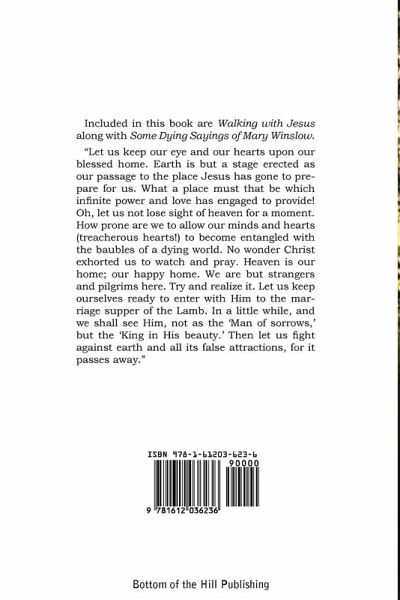 Included in this book are Walking with Jesus along with Some Dying Sayings of Mary Winslow. "Let us keep our eye and our hearts upon our blessed home. Earth is but a stage erected as our passage to the place Jesus has gone to prepare for us. What a place must that be which infinite power and love has engaged to provide! Oh, let us not lose sight of heaven for a moment. How prone are we to allow our minds and hearts (treacherous hearts!) to become entangled with the baubles of a dying world. No wonder Christ exhorted us to watch and pray. Heaven is our home; our happy home. We are but strangers and pilgrims here. Try and realize it. Let us keep ourselves ready to enter with Him to the marriage supper of the Lamb. In a little while, and we shall see Him, not as the 'Man of sorrows,' but the 'King in His beauty.' Then let us fight against earth and all its false attractions, for it passes away."