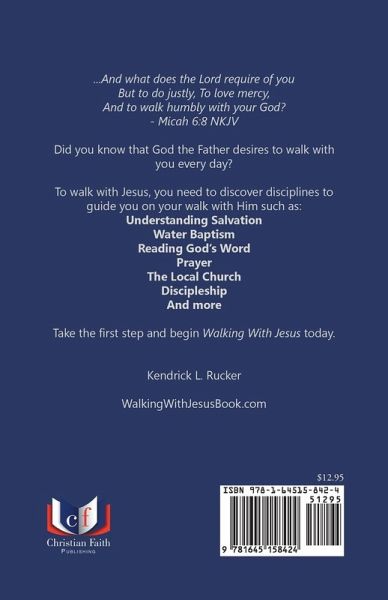 ...And what does the Lord require of you But to do justly, To love mercy, And to walk humbly with your God? - Micah 6:8 NKJV Did you know that God the Father desires to walk with you every day? To walk with Jesus, you need to discover disciplines to guide you on your walk with Him such as: Understanding Salvation Water Baptism Reading God’s Word Prayer The Local Church Discipleship And more Take the first step and begin Walking With Jesus today. Kendrick L. Rucker WalkingWithJesusBook.com