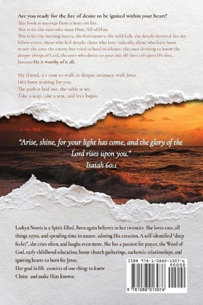 Are you ready for the fire of desire to be ignited within your heart? This book, musings from a heart on fire- FOR the hearts on fire, this is a devotional style book designed to inspire spiritual growth and intimacy with Jesus. With journaling space in between chapters, writing prompts to ponder on, prayers, scriptures to dig into, and invitations to go deeper- this book is for those who want all of Him, who are hungry for a restoration of first love with the Holy Bridegroom, who desire much more than a Sunday morning faith. A deep book, for deep people, who have a deep, deep love for Jesus.