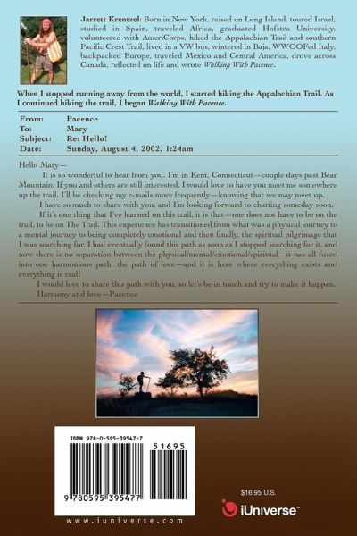 When I stopped running away from the world, I started hiking the Appalachian Trail. As I continued hiking the trail, I began Walking With Pacence. ____________________________________________________________________ From: Pacence To: Mary Subject: Re: Hello! Date: Sunday, August 4, 2002, 1:24am ____________________________________________________________________ Hello Mary- It is so wonderful to hear from you. I'm in Kent, Connecticut-couple days past Bear Mountain. If you and others are still interested, I would love to have you meet me somewhere up the trail. I'll be checking my e-mails more frequently-knowing that we may meet up. I have so much to share with you, and I'm looking forward to chatting someday soon. If it's one thing that I've learned on this trail, it is that-one does not have to be on the trail, to be on The Trail. This experience has transitioned from what was a physical journey to a mental journey to being completely emotional and then finally, the spiritual pilgrimage that I was searching for. I had eventually found this path as soon as I stopped searching for it, and now there is no separation between the physical/mental/emotional/spiritual-it has all fused into one harmonious path, the path of love-and it is here where everything exists and everything is real! I would love to share this path with you, so let's be in touch and try to make it happen. Harmony and love-Pacence