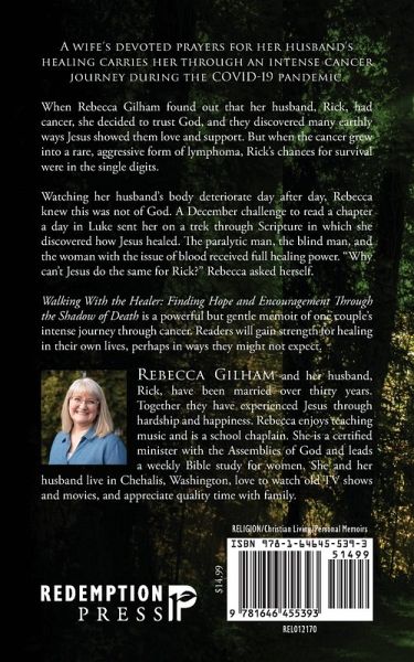 A wife's devoted prayers for her husband's healing carries her through an intense cancer journey during the COVID-19 pandemic. When Rebecca Gilham found out that her husband, Rick, had cancer, she decided to trust God, and they discovered many earthly ways Jesus showed them love and support. But when the cancer grew into a rare, aggressive form of lymphoma, Rick's chances for survival were in the single digits. Watching her husband's body deteriorate day after day, Rebecca knew this was not of God. A December challenge to read a chapter a day in Luke sent her on a trek through Scripture in which she discovered how Jesus healed. The paralytic man, the blind man, and the woman with the issue of blood received full healing power. "Why can't Jesus do the same for Rick?" Rebecca asked herself. Walking With the Healer: Finding Hope and Encouragement Through the Shadow of Death is a powerful but gentle memoir of one couple's intense journey through cancer. Readers will gain strength for healing in their own lives, perhaps in ways they might not expect.