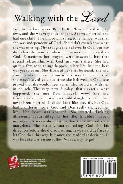 For thirty-three years, Beverly K. Plauche lived on her own, and she was very independent. She was married and had one child. The important thing to remember was that she was independent of God. She didn't even know what she was missing. She thought she believed in God, but she did what she wanted when she wanted. She prayed to God. Sometimes her prayers were answered, but that special relationship with God just wasn't there. She had quite a few good things happen in her life, but the best was yet to come. She divorced her first husband. She had a need and didn't even know what it was. Remember that she wasn't saved yet, but since she believed in God, she prayed that she would meet a man who would sit with her in church. The very next Sunday, that's exactly what happened. She met Don Plauché. Wow! She had fifteen-year-old and six-month-old daughters. Don had never been married. It didn't look like they fit, but God had a different story. God and Don really changed her life. Her heart was changed. She started thinking differently about things in her life. It didn't happen overnight. It was a slow process, but the end results are marvelous. She actually started asking God for his direction before she did something. It was hard at first to let God do it his way, but once she made that decision, it was like she was on autopilot. What a way to go!