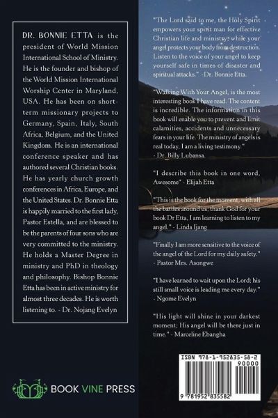 "The Lord said to me, the Holy Spirit empowers your spirit man for effective Christian life and ministry; while your angel protects your body from destruction. Listen to the voice of your angel to keep yourself safe in times of disaster and spiritual attacks." -Dr. Bonnie Etta. "Walking With Your Angel, is the most interesting book I have read. The content is incredible. The information in this book will enable you to prevent and limit calamities, accidents and unnecessary fears in your life. The ministry of angels is real today, I am a living testimony." - Dr. Billy Lubansa. "I describe this book in one word, Awesome" - Elijah Etta "This is the book for the moment, with all the battles around us; thank God for your book Dr Etta, I am learning to listen to my angel." - Linda Ijang "Finally I am more sensitive to the voice of the angel of the Lord for my daily safety." - Pastor Mrs. Asongwe "I have learned to wait upon the Lord; his still small voice is leading me every day." - Ngome Evelyn "His light will shine in your darkest moment; His angel will be there just in time." - Marceline Ebangha