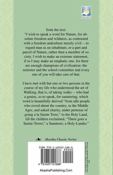 Walking, by Henry David Thoreau - Akasha Classics, AkashaPublishing.Com - I wish to speak a word for Nature, for absolute freedom and wildness, as contrasted with a freedom and culture merely civil - to regard man as an inhabitant, or a part and parcel of Nature, rather than a member of society. I wish to make an extreme statement, if so I may make an emphatic one, for there are enough champions of civilization: the minister and the school committee and every one of you will take care of that. I have met with but one or two persons in the course of my life who understood the art of Walking, that is, of taking walks - who had a genius, so to speak, for SAUNTERING, which word is beautifully derived "from idle people who roved about the country, in the Middle Ages, and asked charity, under pretense of going a la Sainte Terre," to the Holy Land, till the children exclaimed, "There goes a Sainte-Terrer," a Saunterer, a Holy-Lander. They who never go to the Holy Land in their walks, as they pretend, are indeed mere idlers and vagabonds; but they who do go there are saunterers in the good sense, such as I mean. Some, however, would derive the word from sans terre without land or a home, which, therefore, in the good sense, will mean, having no particular home, but equally at home everywhere. For this is the secret of successful sauntering. He who sits still in a house all the time may be the greatest vagrant of all; but the saunterer, in the good sense, is no more vagrant than the meandering river, which is all the while sedulously seeking the shortest course to the sea. But I prefer the first, which, indeed, is the most probable derivation. For every walk is a sort of crusade, preached by some Peter the Hermit in us, to go forth and reconquer this Holy Land from the hands of the Infidels.