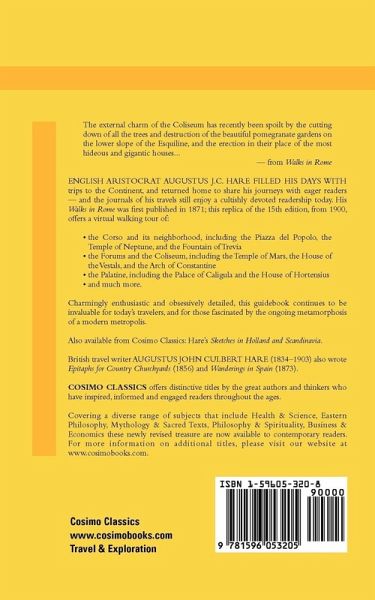 The external charm of the Coliseum has recently been spoilt by the cutting down of all the trees and destruction of the beautiful pomegranate gardens on the lower slope of the Esquiline, and the erection in their place of the most hideous and gigantic houses... -from Walks in Rome English aristocrat Augustus J.C. Hare filled his days with trips to the Continent, and returned home to share his journeys with eager readers-and the journals of his travels still enjoy a cultishly devoted readership today. His Walks in Rome was first published in 1871; this replica of the 15th edition, from 1900, offers a virtual walking tour of: . the Corso and its neighborhood, including the Piazza del Popolo, the Temple of Neptune, and the Fountain of Trevia . the Forums and the Coliseum, including the Temple of Mars, the House of the Vestals, and the Arch of Constantine . the Palatine, including the Palace of Caligula and the House of Hortensius . and much more. Charmingly enthusiastic and obsessively detailed, this guidebook continues to be invaluable for today's travelers, and for those fascinated by the ongoing metamorphosis of a modern metropolis. Also available from Cosimo Classics: Hare's Sketches in Holland and Scandinavia. British travel writer Augustus John Culbert Hare (1834-1903) also wrote Epitaphs for Country Churchyards (1856) and Wanderings in Spain (1873).