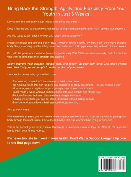 Bring Back the Strength, Agility, and Flexibility From Your Youth in Just 3 Weeks! Do you feel like your body is just riddled with aches and pains? Does it feel like you've been slowly losing your strength and can't accomplish much on your own anymore? Are you ready to turn back the clock and regain your productivity? Fitness instructor and personal trainer Baz Thompson knows exactly how hard it can be to have an aging body. Simply standing up after sitting on a chair can be such a struggle, especially with stiff hips and knees. But, with his years of experience, he's put together easy wall pilates routines specially made for Seniors who want to bring back their strength and balance. Easily improve your balance, muscle tone, and loosen up your stiff joints with these Pilates exercises that you can do right from the comfort of your home! Here are just some things you will discover: * Empowering moves that'll transform your health in no time * No-fuss exercises that don't require any expensive or fancy equipment - all you need is a wall! * How to get back your agility from your younger days in less than a month * Tailor-made 3-week workout routines that fit into your lifestyle and fitness level * Foolproof moves that even absolute fitness beginners can do * A happier life where you can sit, stand, and bend without aching all over * Stronger endurance levels that'll get you through anything And so much more... With exercises so easy, you won't have to worry about overexertion. You'll get results without putting your body through too much strain. It also doesn't matter if this is your first time trying to work out! This is the perfect guide for any senior that wants to take back control of their life. After all, it's never too late to begin your fitness journey. Don't Wait a Second Longer. Scroll Up, and Buy "WALL PILATES FOR SENIORS" Now Before the Price Changes.
