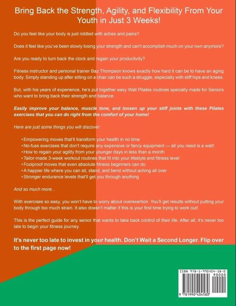 Bring Back the Strength, Agility, and Flexibility From Your Youth in Just 3 Weeks! Do you feel like your body is just riddled with aches and pains? Does it feel like you've been slowly losing your strength and can't accomplish much on your own anymore? Are you ready to turn back the clock and regain your productivity? Fitness instructor and personal trainer Baz Thompson knows exactly how hard it can be to have an aging body. Simply standing up after sitting on a chair can be such a struggle, especially with stiff hips and knees. But, with his years of experience, he's put together easy wall pilates routines specially made for Seniors who want to bring back their strength and balance. Easily improve your balance, muscle tone, and loosen up your stiff joints with these Pilates exercises that you can do right from the comfort of your home! Here are just some things you will discover: * Empowering moves that'll transform your health in no time * No-fuss exercises that don't require any expensive or fancy equipment - all you need is a wall! * How to get back your agility from your younger days in less than a month * Tailor-made 3-week workout routines that fit into your lifestyle and fitness level * Foolproof moves that even absolute fitness beginners can do * A happier life where you can sit, stand, and bend without aching all over * Stronger endurance levels that'll get you through anything And so much more... With exercises so easy, you won't have to worry about overexertion. You'll get results without putting your body through too much strain. It also doesn't matter if this is your first time trying to work out! This is the perfect guide for any senior that wants to take back control of their life. After all, it's never too late to begin your fitness journey. Don't Wait a Second Longer. Scroll Up, and Buy "WALL PILATES FOR SENIORS" Now Before the Price Changes.