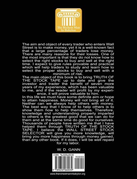 The aim and object of every trader who enters Wall Street is to make money, yet it is a well-known fact that a large percentage of traders lose money. There are many reasons for their losses. One of the most important is that they do not know how to select the right stocks to buy and sell at the right time. I expect to give rules provable and practical which will help traders to study and learn how to select the proper stocks to buy and sell with a minimum of risk. The main object of this book is to bring TRUTH OF THE STOCK TAPE up to date and give the investor and trader the benefit of seven more years of my experience, which has been valuable to me, and if the reader will profit by my experience, it will prove valuable to him. In this life we must have some definite aim or hope to attain happiness. Money will not bring all of it. Neither can we always help others with money. The best way that I know of to help others is to show them how to help themselves. Therefore, knowledge and understanding properly imparted to others is the greatest good that we can do for them and at the same time do good for ourselves. Thousands of people have written me that I have helped them through TRUTH OF THE STOCK TAPE. I believe the WALL STREET STOCK SELECTOR will give you more knowledge, will bring you more happiness through money gained, than any other book. If it does, I will be well repaid for my labor. - W. D. GANN