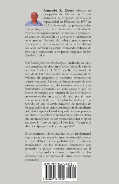 Wall Street: Quien este libre de culpa. analiza las causas y consecuencias del derrumbe de las bolsas de valores de New York en el 2000. La caida ocasiono la perdida de $ 8 trillones afectando los ahorros de 50 millones de pequenos y medianos inversionistas norteamericanos. Las causas fundamentales de esta inmensa perdida estan relacionadas con actividades fraudulentas efectuadas en gran escala y que no fueron detectadas por ninguna de las instituciones gubernamentales encargadas de velar por el buen funcionamiento de los mercados bursatiles, en un periodo en que el establecimiento de medidas de desregulacion financiera constituyo el paradigma de la libre empresa. Debido a que durante esa etapa la cultura de la ambicion arraso con los valores eticos que en otras epocas habian prevalecido, bien se aplica entonces la frase del apostol San Juan: quien este libre de culpa, que tire la primera piedra. El conocimiento de lo sucedido es de fundamental importancia para todos los inversionistas del mundo ya que debido a la globalizacion e internacionalizacion de los mercados financieros este escenario se puede presentar nuevamente en el futuro, afectando en mayor medida a los inversionistas y economias de otros paises menos preparados.