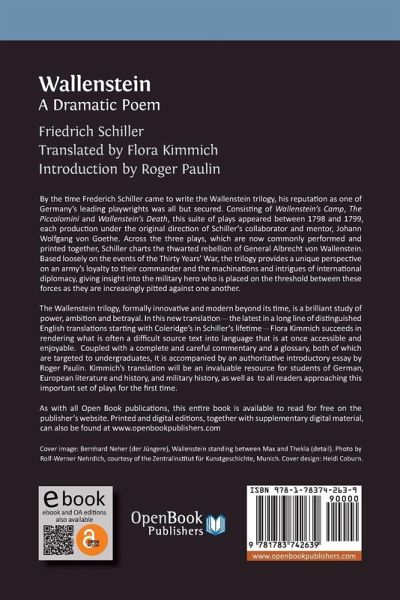 By the time Frederich Schiller came to write the Wallenstein trilogy, his reputation as one of Germany’s leading playwrights was all but secured. Consisting of Wallenstein’s Camp, The Piccolomini and The Death of Wallenstein, this suite of plays appeared between 1798 and 1799, each production under the original direction of Schiller’s collaborator and mentor, Johann Wolfgang (von) Goethe. Across the three plays, which are now commonly performed and printed together, Schiller charts the thwarted rebellion of General Albrecht von Wallenstein. Based loosely on the events of the Thirty Years' War, the trilogy provides a unique vantage on an army’s loyalty to their commander and the machinations and intrigues of international diplomacy, giving insight into the military hero who is placed on the threshold between these forces as they are increasingly pitted against one another. The Wallenstein trilogy, formally innovative and modern beyond its time, is a brilliant study of power, ambition and betrayal. In this new translation—the latest in a long line of distinguished English translations of the play, starting with Coleridge's in Schiller's lifetime—Flora Kimmich succeeds in rendering what is often a difficult source text into language that is at once accessible and enjoyable. Coupled with a complete and careful commentary and a glossary, both of which are targeted to undergraduates, and accompanied by an authoritative introductory essay by Roger Paulin, this edition also includes embedded readings in German of the play and links to the original German text. It will be an invaluable resource for students of German, European literature and history, and military history, as well as to all readers approaching this important set of plays for the first time.