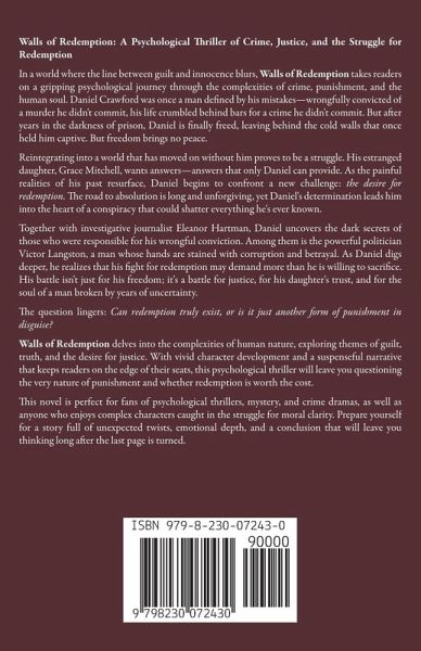 Walls of Redemption: A Psychological Thriller of Crime, Justice, and the Struggle for Redemption In a world where the line between guilt and innocence blurs, Walls of Redemption takes readers on a gripping psychological journey through the complexities of crime, punishment, and the human soul. Daniel Crawford was once a man defined by his mistakes-wrongfully convicted of a murder he didn't commit, his life crumbled behind bars for a crime he didn't commit. But after years in the darkness of prison, Daniel is finally freed, leaving behind the cold walls that once held him captive. But freedom brings no peace. Reintegrating into a world that has moved on without him proves to be a struggle. His estranged daughter, Grace Mitchell, wants answers-answers that only Daniel can provide. As the painful realities of his past resurface, Daniel begins to confront a new challenge: the desire for redemption. The road to absolution is long and unforgiving, yet Daniel's determination leads him into the heart of a conspiracy that could shatter everything he's ever known. Together with investigative journalist Eleanor Hartman, Daniel uncovers the dark secrets of those who were responsible for his wrongful conviction. Among them is the powerful politician Victor Langston, a man whose hands are stained with corruption and betrayal. As Daniel digs deeper, he realizes that his fight for redemption may demand more than he is willing to sacrifice. His battle isn't just for his freedom; it's a battle for justice, for his daughter's trust, and for the soul of a man broken by years of uncertainty. The question lingers: Can redemption truly exist, or is it just another form of punishment in disguise? Walls of Redemption delves into the complexities of human nature, exploring themes of guilt, truth, and the desire for justice. With vivid character development and a suspenseful narrative that keeps readers on the edge of their seats, this psychological thriller will leave you questioning the very nature of punishment and whether redemption is worth the cost. This novel is perfect for fans of psychological thrillers, mystery, and crime dramas, as well as anyone who enjoys complex characters caught in the struggle for moral clarity. Prepare yourself for a story full of unexpected twists, emotional depth, and a conclusion that will leave you thinking long after the last page is turned.