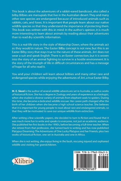 This book is about the adventures of a rabbit-eared bandicoot, also called a bilby. Bilbies are rare marsupials that live in the desert. They and many other rare species are endangered because of introduced animals such as rabbits, cats, and foxes. It is important that people learn about our native wildlife species so that they understand the importance of protecting them. This book was written with this in mind. In the author's opinion, it is much more interesting to learn about animals by reading about their adventures than to read dry scientific information. This is a real-life story in the style of Watership Down, where the animals act as they would in nature. The Easter Bilby concept is not new, but this is an Easter Bilby story that stays true to the nature of these animals. Jirri does not wear a suit and speak English. There is an Easter connection, but it is woven into the story of an animal fighting to survive in a hostile environment. It is the story of the triumph of life in difficult circumstances and has a message of hope for all who read it. You and your children will learn about bilbies and many other rare and endangered species while enjoying the adventures of Jirri, a true Easter Bilby.
