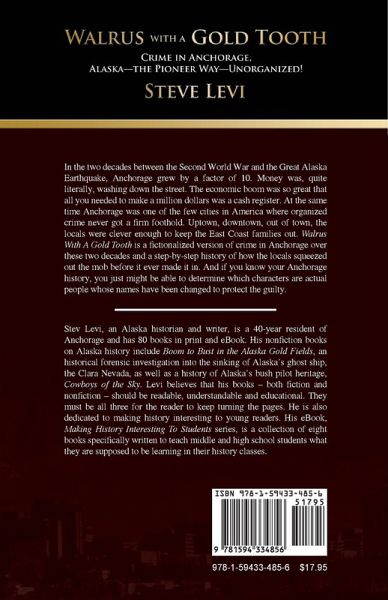 In the two decades between the Second World War and the Great Alaska Earthquake, Anchorage grew by a factor of 10. Money was, quite literally, washing down the street. The economic boom was so great that all you needed to make a million dollars was a cash register. At the same time Anchorage was one of the few cities in America where organized crime never got a firm foothold. Uptown, downtown, out of town, the locals were clever enough to keep the East Coast families out. Walrus With A Gold Tooth is a fictionalized version of crime in Anchorage over these two decades and a step-by-step history of how the local squeezed out the mob before it ever made it in. And if you know your Anchorage history, you just might be able to determine which characters are actual people whose names have been changed to protect the guilty.