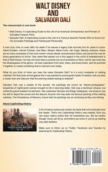 If you want to discover the captivating lives of Walt Disney and Salvador Dalí, then keep reading... Two captivating manuscripts in one book: Walt Disney: A Captivating Guide to the Life of an American Entrepreneur and Pioneer of Animated Cartoon Films Salvador Dalí: A Captivating Guide to the Life of a Famous Spanish Painter Who Is Known for His Surrealist Paintings and Flamboyant Personality A man truly lives on even after his death if he leaves a legacy that survives him for years to come. Albert Einstein, Harriet Tubman, Karl Marx, Mozart, Marie Curie, Van Gogh, Marsha Johnson-there are so many examples of men and women whose deeds revolutionized history and paved the way for future generations to thrive. One name that stands out in this regard in the world of entertainment is that of Walt Disney. He may not have been a pioneer per se of animation or films, but he was more like the Shakespeare of his genre-he took inspiration from here, there, and everywhere, and he punched it together to create something that is relevant even today. Salvador Dalí was a master of the surreal. His paintings are known as "dream-photographs": snapshots of nightmarish scenes brought to life in stunning detail. Dalí was a technical virtuoso, but unlike the grand masters he admired-like Johannes Vermeer and Diego Velázquez-he chose to use his skill to depict the unreal and the absurd. Anyone who has seen his famous painting of the melting watches, The Persistence of Memory, knows that his paintings are as confusing as they are striking. Part 1 of this book covers the life of Walt Disney and here are some of the topics included: Humble Beginnings The First Step The Independent Move New Leaf PBrush with Bankruptcy Hello to Hollywood Famous in LA Foray into the Big Leagues The Birth of Mickey Mouse Disney Movie Magic Disney, the Megabrand And much, much more! Part 2 of this book covers the life of Salvador Dalí and here are some of the topics included: Prehistory to Picasso Growing Wings Rebellion Risen Star Fame and Eccentricity The Bathtub and the Window Flight Going Home Farewell to the Muse The Marquis' Last Drawing The Immortal Mustache And much, much more! So if you want to learn more about Walt Disney and Salvador Dalí, scroll up and click the "add to cart" button!