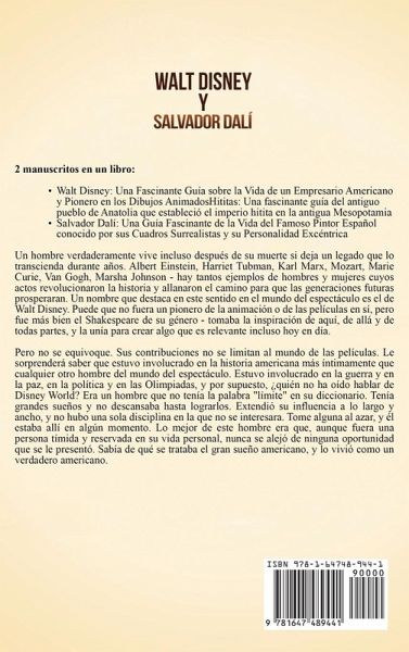 2 manuscritos completos en 1 libroWalt Disney: Una Fascinante Guía sobre la Vida de un Empresario Americano y Pionero en los Dibujos Animados Salvador Dalí: Una Guía Fascinante de la Vida del Famoso Pintor Español conocido por sus Cuadros Surrealistas y su Personalidad Excéntrica Un hombre verdaderamente vive incluso después de su muerte si deja un legado que lo transcienda durante años. Albert Einstein, Harriet Tubman, Karl Marx, Mozart, Marie Curie, Van Gogh, Marsha Johnson - hay tantos ejemplos de hombres y mujeres cuyas acciones revolucionaron la historia y allanaron el camino para que las generaciones futuras prosperaran. Un nombre que destaca en este sentido en el mundo del entretenimiento es el de Walt Disney. Puede que no fuera un pionero de la animación o de las películas en sí, pero fue más bien el Shakespeare de su género: tomaba la inspiración de aquí, de allá y de todas partes, y la combinaba para crear algo que es relevante incluso hoy en día. La primera parte de este libro incluye:Humildes Comienzos El Primer Paso El Paso hacia la Independencia Una Nueva Página Pintar en bancarrota Hola Hollywood Famoso en Los Ángeles Incursión en las Grandes Ligas El nacimiento de Mickey Mouse La Magia de las Películas de Disney Disney, la Mega Marca ¡Y mucho, mucho más! Segunda parte de este libro, usted:De la prehistoria a Picasso Creciendo alas Rebelión Artista revelación Fama y excentricidad La bañera y el escaparate Vuelo Vuelta a casa El adiós a la musa El último dibujo del marqués El bigote inmortal ¡Y mucho, mucho más! ¡Consiga este libro ahora para conocer más sobre Walt Disney y Salvador Dalí!