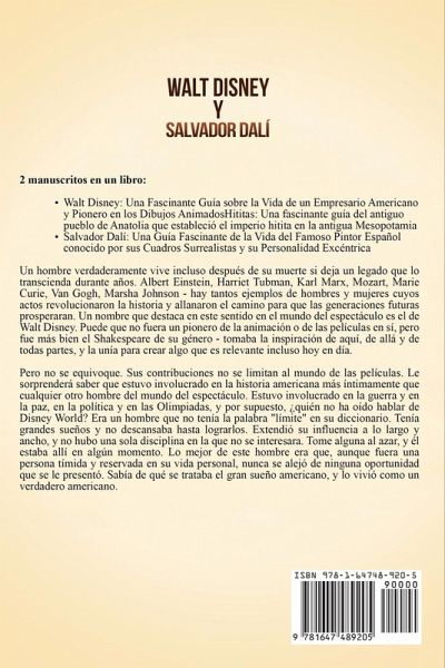 2 manuscritos completos en 1 libroWalt Disney: Una Fascinante Guía sobre la Vida de un Empresario Americano y Pionero en los Dibujos Animados Salvador Dalí: Una Guía Fascinante de la Vida del Famoso Pintor Español conocido por sus Cuadros Surrealistas y su Personalidad Excéntrica Un hombre verdaderamente vive incluso después de su muerte si deja un legado que lo transcienda durante años. Albert Einstein, Harriet Tubman, Karl Marx, Mozart, Marie Curie, Van Gogh, Marsha Johnson - hay tantos ejemplos de hombres y mujeres cuyas acciones revolucionaron la historia y allanaron el camino para que las generaciones futuras prosperaran. Un nombre que destaca en este sentido en el mundo del entretenimiento es el de Walt Disney. Puede que no fuera un pionero de la animación o de las películas en sí, pero fue más bien el Shakespeare de su género: tomaba la inspiración de aquí, de allá y de todas partes, y la combinaba para crear algo que es relevante incluso hoy en día. La primera parte de este libro incluye:Humildes Comienzos El Primer Paso El Paso hacia la Independencia Una Nueva Página Pintar en bancarrota Hola Hollywood Famoso en Los Ángeles Incursión en las Grandes Ligas El nacimiento de Mickey Mouse La Magia de las Películas de Disney Disney, la Mega Marca ¡Y mucho, mucho más! Segunda parte de este libro, usted:De la prehistoria a Picasso Creciendo alas Rebelión Artista revelación Fama y excentricidad La bañera y el escaparate Vuelo Vuelta a casa El adiós a la musa El último dibujo del marqués El bigote inmortal ¡Y mucho, mucho más! ¡Consiga este libro ahora para conocer más sobre Walt Disney y Salvador Dalí!