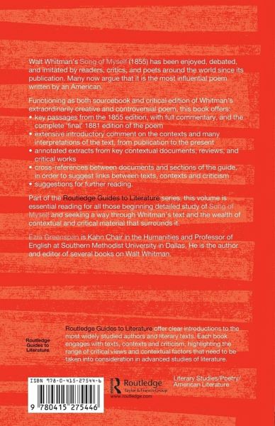 Since 1855, Walt Whitman's 'Song of Myself' has been enjoyed, debated, parodied and imitated by readers, critics and artists crossing national and linguistic boundaries. Many argue that it is the most influential poem ever written by an American. This Routledge Literary Sourcebook provides easy access to: contextual information, including biographical details and a chronology an overview of the poem's critical reception and extracts from important criticism, with clear introductory headnotes key passages from the original 1855 edition, with commentary and annotation the full 'final' 1881 edition of the poem. Cross-references link the critical, contextual and textual sections and suggestions for further reading complete the volume. This sourcebook is ideal for readers with no knowledge of the poem, or for those returning anew to a favourite text.