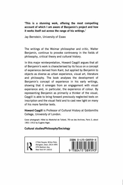 This book analyses the development of Benjamin's concept of experience in his early writings showing that it emerges from an engagement with visual experience, and in particular the experience of colour.