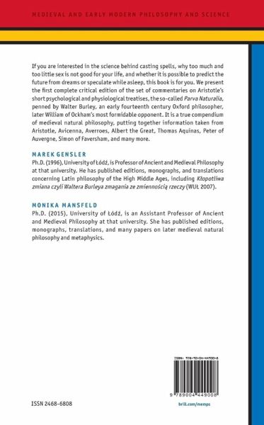 If you are interested in the science behind casting spells, why too much and too little sex is not good for your life, and whether it is possible to predict future from dreams or speculate while asleep, this book is for you. We present the first complete critical edition of the set of commentaries on Aristotle's short psychological and physiological treatises, the so-called Parva Naturalia, penned by Walter Burley, an early fourteenth century Oxford philosopher, later William of Ockham's most formidable opponent. It is a true compendium of medieval natural philosophy, putting together information taken from Aristotle, Avicenna, Averroes, Albert the Great, Thomas Aquinas, Peter of Auvergne, Simon of Faversham, and many more.