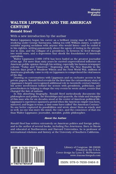 In this absorbing biography, Ronald Steel meticulously documents the philosophers and politics, the friendships and quarrels, the trials and triumphs of this man who for six decades stood at the center of American political life. Lippmann's experience spanned a period when the American empire was born, matured, and began to wane, a time some have called "the American Century." No one better captured its possibilities and wrote about them so wisely and so well, no one was more the mind, the voice, and the conscience of that era than Walter Lippmann: journalist, moralist, public philosopher.