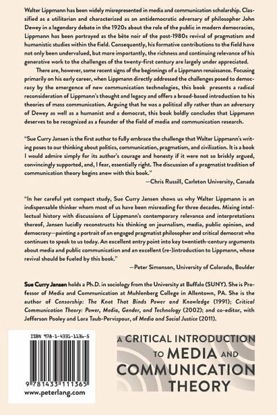 Arguing that he was a political ally rather than an adversary of Dewey as well as a humanist and a democrat, influenced by William James' pragmatism and George Santayana's critical realism, Jansen contends that Lippmann developed a fully formed social constructivism decades before Peter L. Berger and Thomas Luckman's seminal 1966 treatise, The Social Construction of Reality. She boldly concludes that Lippmann deserves to be recognized as a founder of the field of media and communication research.