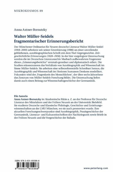 Der Münchener Ordinarius für Neuere deutsche Literatur Walter Müller-Seidel (1918-2010) arbeitete seit seiner Emeritierung (1986) an einer unvollendet gebliebenen, autobiographischen Schrift mit dem Titel Gegengewichte. Zeitgeschichtliche Erinnerungen (1928-1958). In der hier vorgelegten Untersuchung werden die im Deutschen Literaturarchiv Marbach aufbewahrten Fragmente dieses «Erinnerungsberichts» erstmals geordnet und diplomatisch ediert. Die Studien rekonstruieren das Verhältnis von Autobiographik und Wissenschaft im Sinne Müller-Seidels. Sie arbeiten eine selbstreferentielle Schreibart heraus, die Autobiographik und Wissenschaft im Horizont humanen Denkens modelliert. Fokussiert wird der 'Fragenkreis des Menschlichen', der über sechs Jahrzehnte das Zentrum von Müller-Seidels Forschung bildet. Die Untersuchung liefert damit auch einen Beitrag zur Wissenschaftsgeschichte der Germanistik.