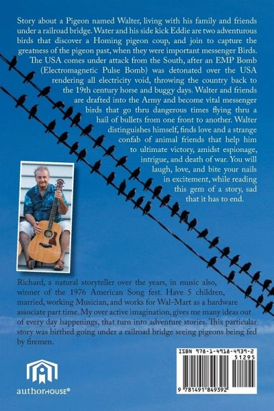 Story about a Pigeon named Walter, living with his family and friends under a railroad bridge. Water and his side kick Eddie are two adventurous birds that discover a Homing pigeon coup, and join to capture the greatness of the pigeon past, when they were important messenger Birds. The USA comes under attack from the South, after an EMP Bomb (Electromagnetic Pulse Bomb) was detonated over the USA rendering all electricity voids, throwing the country back to the 19th century horse and buggy days. Walter and friends are drafted into the Army and become vital messenger birds that go thru dangerous times flying thru a hail of bullets from one front to another. Walter distinguishes himself, finds love and a strange confab of animal friends that help him to ultimate victory, amidst espionage, intrigue, and death of war. You will laugh, love, and bite your nails in excitement, while reading this gem of a story, sad that it has to end.