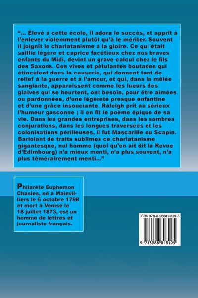 "... Élevé à cette école, il adora le succès, et apprit à l'enlever violemment plutôt qu'à le mériter. Souvent il joignit le charlatanisme à la gloire. Ce qui était saillie légère et caprice facétieux chez nos braves enfants du Midi, devint un grave calcul chez le fils des Saxons. Ces vives et pétulantes boutades qui étincèlent dans la causerie, qui donnent tant de relief à la guerre et à l'amour, et qui, dans la mêlée sanglante, apparaissent comme les lueurs des glaives qui se heurtent, ont besoin, pour être aimées ou pardonnées, d'une légèreté presque enfantine et d'une grâce insouciante. Raleigh prit au sérieux l'humeur gasconne ; il en fit le poème épique de sa vie. Dans les grandes entreprises, dans les sombres conjurations, dans les longues traversées et les colonisations périlleuses, il fut Mascarille ou Scapin. Bariolant de traits sublimes ce charlatanisme gigantesque, nul homme (quoi qu'en ait dit la Revue d'Édimbourg) n'a mieux menti, n'a plus souvent, n'a plus témérairement menti..."