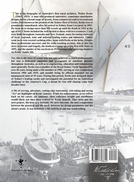 This is the biography of Australia's first naval architect, Walter Reeks (1861 - 1925). A man who produced innovative, sometimes unorthodox designs across a broad range of vessels, from commercial craft to recreational yachts. Best known as the pioneer of the Sydney fleet of ferries, Reeks rose to prominence immediately after his arrival in Sydney from Liverpool in 1885. He went on to design more than 300 vessels up until his death in 1925 at the age of 64. Clients included the well-heeled to those with less resources. Craft were built throughout Australia and New Zealand, many becoming stalwarts of local, regional, state and national trading routes and industries. Others went on to win coveted yachting titles, some with Reeks at the helm. Despite these professional successes and his wide-reaching acclaim, this is also the story of sorrow and tragedy, the death at a young age of his first wife Mary in 1895, and the murder of his son Kent in 1914 casting large, grieving shadows on Reeks' family life. Yet, this is the story of a man who not only achieved so much professionally but was a dedicated supporter and protagonist of maritime pursuits throughout Australia, as well as to engineering, education and volunteering more generally. Reeks was a member of the Royal Sydney Yacht Squadron for over 40 years, being made a life member in 1900, serving as vice-commodore between 1906 and 1910, and notably being its official measurer for an unsurpassed stint of 39 years. During this period, Reeks also designed many of Sydney's leading yachts and investigated the potential for an Australian challenge to the America's Cup, a dream he was still chasing some four decades later. A life of serving, adventure, cutting-edge innovation, risk-taking and saying 'Yes!' are highlights of Reeks' journey. While his achievements, as we reflect back on his career, are immense, their collective weight and worthiness would likely not have been realised by Reeks himself. They were just the next project, the next step forward, the next outcome, the next compromise between the practical and the ideal, between his design parameters and his client's needs. It was definitely a life well lived and one worth telling.
