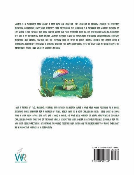 Walter is a children's book about a frog with an umbrella. The umbrella is rainbow colored to represent inclusion, acceptance, unity, and diversity. More specifically, the umbrella is a metaphor for Walter's outlook on life, which is the focus of the book. Walter, older and more seasoned than all his other pond dwelling neighbors, sees life a bit differently than others. Walter's message is one of community, teamwork, understanding, patience, inclusion, and coming together for the common good in times of crisis. Having learned this lesson after a harrowing experience involving a natural disaster, the pond community sees the light and in turn realizes the importance, truth, and value in Walter's message.
