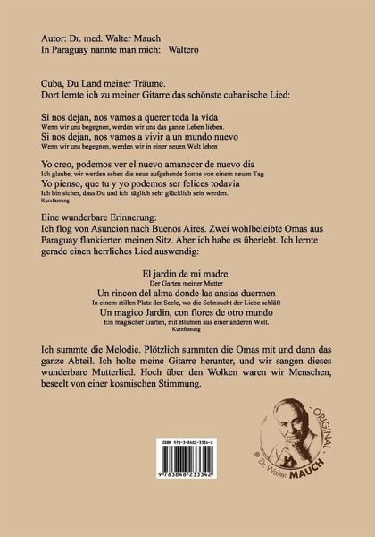 Villa Tortuga Cuba - ein Traum von drei Wochen wurde wahr. Ich begegnete Menschen in einer anderen Welt, und ich möchte sagen, in einer anderen Dimension. So war ich weit entfernt von dem unseligen, geldgierigen Treiben in der Heimat. Ich hatte immer dasselbe Hemd, dieselbe kurze Hose, dieselben Sandaletten an, gereinigt im Meer, gebügelt von der Sonne. Ich fühlte mich arm wie die Cubaner, aber glücklich, unendlich glücklich. So sagt man bei uns zu den Cubanern: arme Menschen, die in einer offenen Hütte hausen. Nein, Sie waren unendlich reich. Ich musste erkennen, dass wir mit unserem Geldtrieb unendlich arm sind. Ich hatte Fidel Castro bereits bei einem Staatsbesuch in Paraguay persönlich kennengelernt. Ich kann nun allen Gerüchten zum Trotz sagen: eine großartige Erscheinung und ein großartiger Mensch. Dann begegnete ich auf Cuba der berühmten Malerin Leonor. Sie nannte mich mit meiner Guitarre Waltero - el Che Guevara de Alemania. Ja, ja ich war wirklich in einer anderen Welt. Ich nehme diese Gefühle heute noch wahr, wenn ich an Cuba denke!Diese Wochen auf Cuba waren wie ein Traum. Ich träumte wirklich - eingebettet in diesen cubanischen Rhythmus und vergas die Welt.