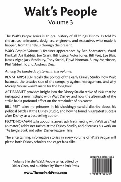 Disney History from the Source The Walt's People series is an oral history of all things Disney, as told by the artists, animators, designers, engineers, and executives who made it happen, from the 1920s through the present. Walt's People: Volume 3 features appearances by Ben Sharpsteen, Ward Kimball, Art Babbitt, Joe Grant, Bill Justice, Volus Jones, Bill Peet, Lee Blair, James Algar, Jack Bradbury, Tony Strobl, Floyd Norman, Burny Mattinson, Phil Nibbelink, and Andreas Deja. Among the hundreds of stories in this volume: BEN SHARPSTEEN recalls the politics of the early Disney Studio, how Walt balanced the creative side of the company against management, and why Mickey Mouse wasn't made for the long haul. ART BABBITT provides insight into the Disney Studio strike of 1941 that he instigated, a near fistfight with Walt Disney, and how the aftermath of the strike had a profound effect on the remainder of his career. BILL PEET takes no prisoners in his shockingly candid diatribe about his political battles at the Disney Studio, and how he found his greatest success after Disney, as a best-selling author. FLOYD NORMAN talks about his awestruck first meeting with Walt as a "kid animator", addresses racism at the Disney Studio, and discusses his work on The Jungle Book and other Disney feature films. The entertaining, informative stories in every volume of Walt's People will please both Disney scholars and eager fans alike.