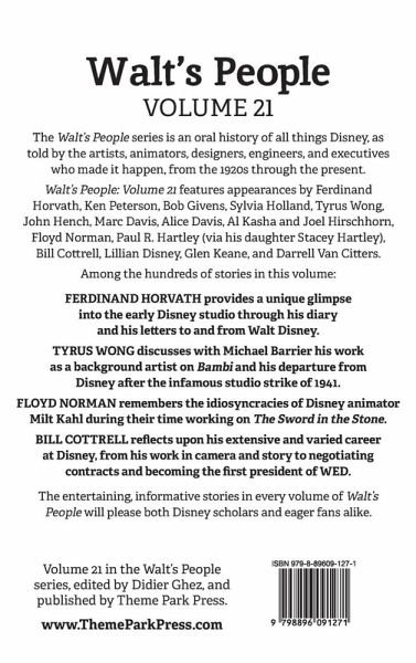 Disney History from the Source The Walt's People series is an oral history of all things Disney, as told by the artists, animators, designers, engineers, and executives who made it happen, from the 1920s through the present. Walt's People: Volume 21 features appearances by Ferdinand Horvath, Ken Peterson, Bob Givens, Sylvia Holland, Tyrus Wong, John Hench, Marc Davis, Alice Davis, Al Kasha and Joel Hirschhorn, Floyd Norman, Paul R. Hartley (via his daughter Stacey Hartley), Bill Cottrell, Lillian Disney, Glen Keane, and Darrell Van Citters. Among the hundreds of stories in this volume: FERDINAND HORVATH provides a unique glimpse into the early Disney studio through his diary and his letters to and from Walt Disney. TYRUS WONG discusses with Michael Barrier his work as a background artist on Bambi and his departure from Disney after the infamous studio strike of 1941. FLOYD NORMAN remembers the idiosyncrasies of Disney animator Milt Kahl during their time working on The Sword in the Stone. BILL COTTRELL reflects upon his extensive and varied career at Disney, from his work in camera and story to negotiating contracts and becoming the first president of WED. The entertaining, informative stories in every volume of Walt's People will please both Disney scholars and eager fans alike.