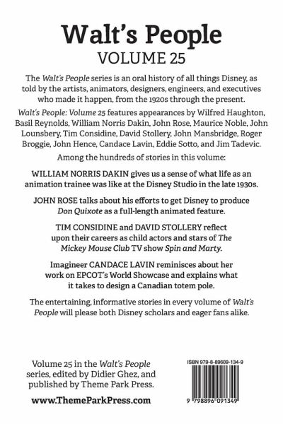 Disney History from the Source The Walt's People series is an oral history of all things Disney, as told by the artists, animators, designers, engineers, and executives who made it happen, from the 1920s through the present. Walt's People: Volume 25 features appearances by Wilfred Haughton, Basil Reynolds, William Norris Dakin, John Rose, Maurice Noble, John Lounsbery, Tim Considine, David Stollery, John Mansbridge, Roger Broggie, John Hence, Candace Lavin, Eddie Sotto, and Jim Tadevic. Among the hundreds of stories in this volume: WILLIAM NORRIS DAKIN gives us a sense of what life as an animation trainee was like at the Disney Studio in the late 1930s. JOHN ROSE talks about his efforts to get Disney to produce Don Quixote as a full-length animated feature. TIM CONSIDINE and DAVID STOLLERY reflect upon their careers as child actors and stars of The Mickey Mouse Club TV show Spin and Marty. Imagineer CANDACE LAVIN reminisces about her work on EPCOT's World Showcase and explains what it takes to design a Canadian totem pole. The entertaining, informative stories in every volume of Walt's People will please both Disney scholars and eager fans alike.