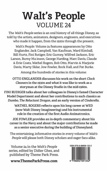 Disney History from the Source Walt's People: Volume 24 features appearances by Otto Englander, Jack Campbell, Van Kaufman, Ward Kimball, Bill Hurtz, Fini Rutiger, Eric Gurney, Wilfred Jackson, Eric Larson, Burny Mattinson, George Harding, Marc Davis, Claude Evie Coats, Wathel Rogers, Bob Otto, Marvin & Marjorie Davis, Marty Sklar, Jow Fowler, Rock Hall, and Pat Burke. The Walt's People series is an oral history of all things Disney, as told by the artists, animators, designers, engineers, and executives who made it happen, from the 1920s through the present. Among the hundreds of stories in this volume: OTTO ENGLANDER discusses his work on the short Clock Cleaners in the 1930s and what it was like to work as a story man at the Disney Studio in the mid-1960s. FINI RUDIGER talks about her colleagues in Disney's famed Character Model Department and about her contributions to such classics as Dumbo,& The Reluctant Dragon, and an early version of Cinderella. WATHEL ROGERS reflects upon his long career at WED (now Walt Disney Imagineering) and his instrumental role in the creation of the first Audio-Animatronics. JOE FOWLER provides an in-depth commentary about his career in the Navy and about the major contributions he made as a senior executive during the building of Disneyland. The entertaining, informative stories in every volume of Walt's People will please both Disney scholars and eager fans alike.