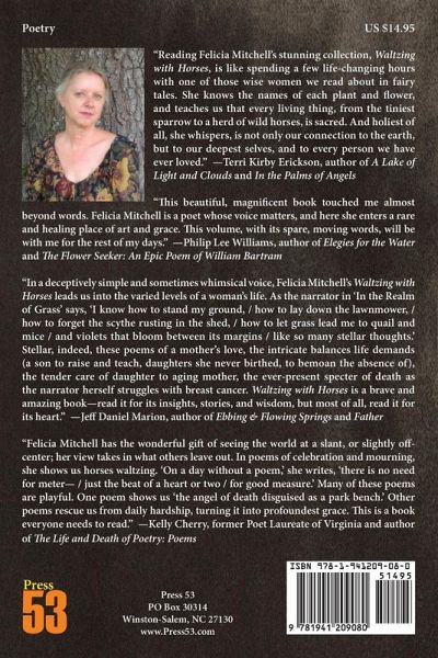 "Reading Felicia Mitchell's stunning collection, Waltzing with Horses, is like spending a few life-changing hours with one of those wise women we read about in fairy tales. She knows the names of each plant and flower, and teaches us that every living thing, from the tiniest sparrow to a herd of wild horses, is sacred. And holiest of all, she whispers, is not only our connection to the earth, but to our deepest selves, and to every person we have ever loved." -Terri Kirby Erickson, author of A Lake of Light and Clouds and In the Palms of Angels
