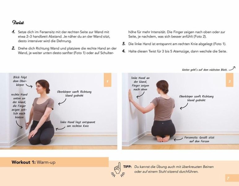 Die Wand liefert die nötige Stabilität und Sicherheit. Sanfte Dehnungen steigern die Beweglichkeit, die tieferen Muskeln und Faszien werden trainiert und gekräftigt.