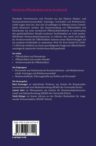 Namhafte Vertreterinnen und Vertreter aus den Fächern Medien- und Kommunikationswissenschaft, Soziologie, Geschichte und Politikwissenschaft tragen dazu bei, dass drei Grundfragen im Rahmen dieses Gedenkbands illuminiert werden: den Zusammenhang von Öffentlichkeit und Demokratie aus einer normativen Öffentlichkeitstheorie zu untersuchen; den gesellschaftlichen Wandel moderner Gesellschaften im Licht medienöffentlicher Kommunikationsprozesse zu erfassen; den neuen und digitalen Strukturwandel der Öffentlichkeit mitsamt seinen Rückwirkungen auf die moderne Gesellschaft zu analysieren. Prof. Dr. Kurt Imhof (17.1.1956 - 1.3.2015) hat zeitlebens an diesen grundlegenden Fragen der öffentlichkeitssoziologisch inspirierten Sozialwissenschaft gearbeitet.