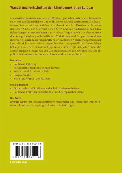 Die christdemokratischen Parteien Westeuropas sahen sich zuletzt besonders stark mit gesellschaftlichem und politischem Wandel konfrontiert. Die Reaktionen dieser einst hyperstabilen christdemokratischen Parteien der bundesdeutschen CDU, der österreichischen ÖVP und des niederländischen CDA fielen dagegen umso mächtiger aus. Andreas Wagner stellt dar, dass es trotz der einst gefestigten gesellschaftlichen Verhältnisse und der ganz besonderen innerparteilichen Beharrungskräfte zu erstaunlichen Veränderungsprozessen kam, die sich immer wieder gegenüber den innerparteilichen Vetospielern behaupten mussten. Gerade in Oppositionszeiten zeigte sich jedoch über die Landesgrenzen hinweg, wie die Christdemokratien die Zeit nutzten, um als politische Großorganisationen zu lernen und sich zu verändern.