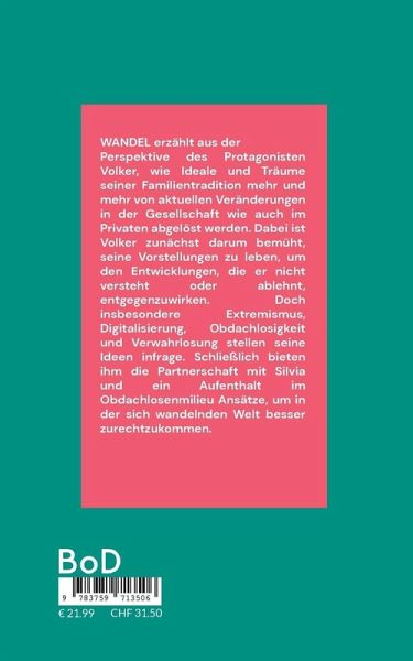 WANDEL erzählt aus der Perspektive des Protagonisten Volker, wie Ideale und Träume seiner Familientradition mehr und mehr von aktuellen Veränderungen in der Gesellschaft wie auch im Privaten abgelöst werden. Dabei ist Volker zunächst darum bemüht, seine Vorstellungen zu leben, um den Entwicklungen, die er nicht versteht oder ablehnt, entgegenzuwirken. Doch insbesondere Extremismus, Digitalisierung, Obdachlosigkeit und Verwahrlosung stellen seine Ideen infrage. Schließlich bieten ihm die Partnerschaft mit Silvia und ein Aufenthalt im Obdachlosenmilieu Ansätze, um in der sich wandelnden Welt besser zurechtzukommen.…mehr