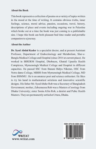This book represents a collection of poems on a variety of topics written in the mood at the time of writing. It contains obvious truths, inner feelings, science, moral advice, passion, occasions, travel, history, descriptions of place and events including ongoing war in Palestine which broke out at a time the book was just coming to a publishable size. I hope this book can both pleasant bed time reader and portable companion to a journey.