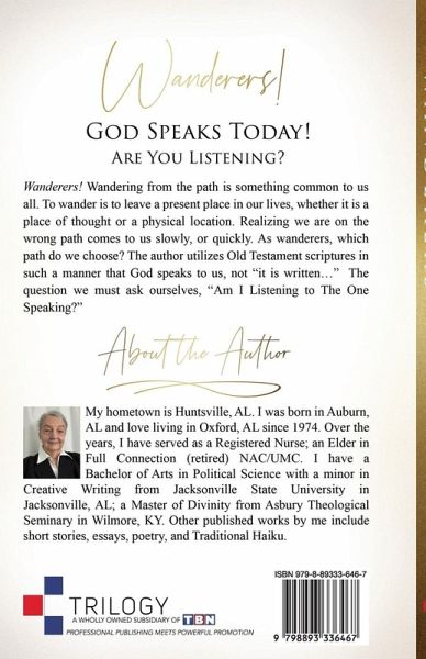 Wanderers! Wandering from the path is something common to us all. To wander is to leave a present place in our lives, whether it is a place of thought or a physical location. Realizing we are on the wrong path comes to us slowly, or quickly. As wanderers, which path do we choose? The author utilizes Old Testament scriptures in such a manner that God speaks to us, not "it is written..." The question we must ask ourselves, "Am I Listening to The One Speaking?"