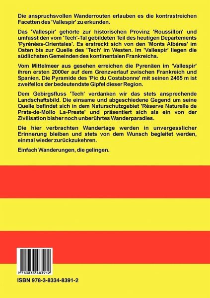 Die anspruchsvollen Wanderrouten erlauben es die kontrastreichen Facetten des 'Vallespir' zu erkunden. Das 'Vallespir' gehörte zur historischen Provinz 'Roussillon' und umfasst den vom 'Tech'-Tal gebildeten Teil des heutigen Departements 'Pyrénées-Orientales'. Es erstreckt sich von den 'Monts Albères' im Osten bis zur Quelle des 'Tech' im Westen. Im 'Vallespir' liegen die südlichsten Gemeinden des kontinentalen Frankreichs. Vom Mittelmeer aus gesehen erreichen die Pyrenäen im 'Vallespir' ihren ersten 2000er auf dem Grenzverlauf zwischen Frankreich und Spanien. Die Pyramide des 'Pic du Costabonne' mit seinen 2465 m ist zweifellos der bedeutendste Gipfel dieser Region. Dem Gebirgsfluss 'Tech' verdanken wir das stets ansprechende Landschaftsbild. Die einsame und abgeschiedene Gegend um seine Quelle befindet sich in dem Naturschutzgebiet 'Réserve Naturelle de Prats-de-Mollo La-Preste' und präsentiert sich als ein von der Zivilisation bisher noch unberührtes Wanderparadies.Die hier verbrachten Wandertage werden in unvergesslicher Erinnerung bleiben und stets von dem Wunsch begleitet werden, einmal wieder zurückzukehren.Einfach Wanderungen, die gelingen.