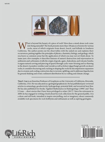 What is beyond the beauty of a piece of rock? How does a stand-alone rock come into being naturally? The book presents more than 100 pieces of stories for various rocks, most of which originate from desert, beach, and hillside in Southern California. The author points out the observables with the naked eye and explains their occurrences, putting together the principles of physics, chemistry, biology, and geology, which you know as common sense but the application of which you may not yet think about. To name just a few examples: it describes features of nature's destruction and rejuvenation in sediments and carbonates; it tells the origin of geode, agate, chalcedony, and volcanic bombs; it argues natural carving and piercing of quartz through cyclic water freezing and ice thawing in the desert; it ponders ventifact and varnish as well as lichen (algae/fungi) growth on desert rocks; it considers fracturing and cracking in shaping the rocks by decompression expansion due to erosion and cooling contraction due to tectonic uplifting; and it addresses liquefaction by ground shaking and erratic sediment distribution by ice rafting and climate change.