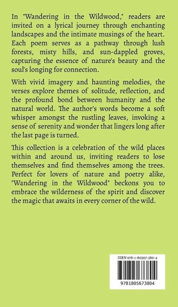 In "Wandering in the Wildwood," readers are invited on a lyrical journey through enchanting landscapes and the intimate musings of the heart. Each poem serves as a pathway through lush forests, misty hills, and sun-dappled groves, capturing the essence of nature's beauty and the soul's longing for connection. With vivid imagery and haunting melodies, the verses explore themes of solitude, reflection, and the profound bond between humanity and the natural world. The author's words become a soft whisper amongst the rustling leaves, invoking a sense of serenity and wonder that lingers long after the last page is turned. This collection is a celebration of the wild places within and around us, inviting readers to lose themselves and find themselves among the trees. Perfect for lovers of nature and poetry alike, "Wandering in the Wildwood" beckons you to embrace the wilderness of the spirit and discover the magic that awaits in every corner of the wild.