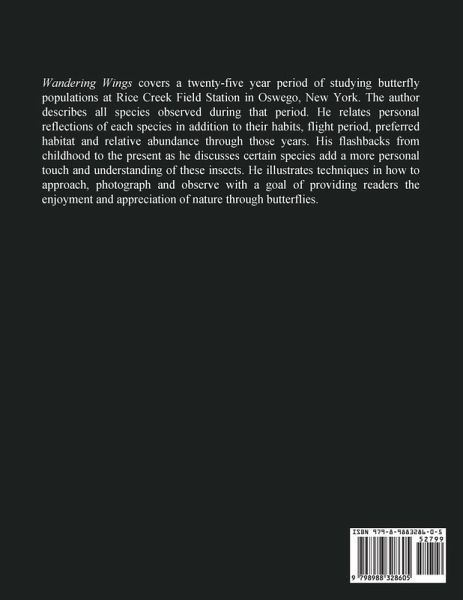 Wandering Wings covers a twenty-five year period of studying butterfly populations at Rice Creek Field Station in Oswego, New York. The author describes all species observed during that period. He relates personal reflections of each species in addition to their habits, flight period, preferred habitat and relative abundance through those years. His flashbacks from childhood to the present as he discusses certain species add a more personal touch and understanding of these insects. He illustrates techniques in how to approach, photograph and observe with a goal of providing readers the enjoyment and appreciation of nature through butterflies.